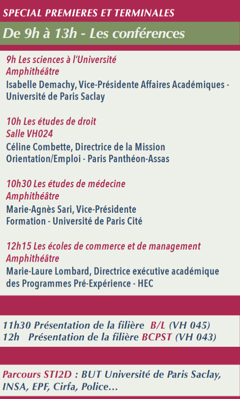 - le matin pour les lycéens de Première et Terminale : Les Sciences à l’Université, les études de Droit, de Médecine, et Spécial ECG : conférence HEC.